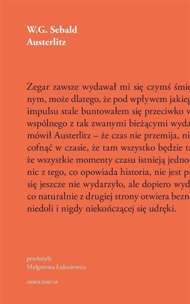 Austerlitz to powieść na wskroś aktualna, ze zdwojoną siłą przypominająca wydarzenia, które zbyt łatwo ulatują z pamięci ludzkości. Mimo że w książce tej wszystko wydaje się nadzwyczaj zrozumiałe, przejrzysta proza Sebalda kluczy i zwodzi, odkrywając coraz to nowe światy: te rzeczywiste i te wyobrażone.