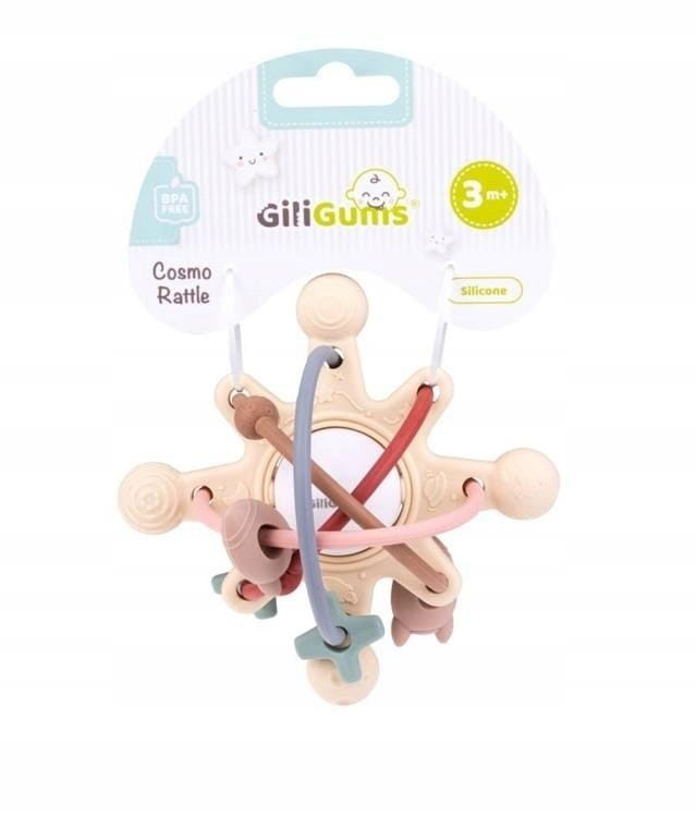 Pastelowa grzechotka wprowadzi do świata Twojego Malucha odrobinę magii w stylowej, galaktycznej odsłonie. W centralnym punkcie znajduje się grzechoczące kula, a naokoło niej rozpościerają się miękkie, elastyczne linki, po których przesuwać możemy ruchome elementy. Kształt zabawki i jej wymiary są idealnie dostosowane do małych rączek. Grzechotkę zdobią wypustki o zróżnicowanych kształtach, które przyniosą ulgę ząbkującemu dziecku