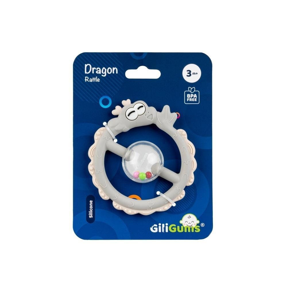 Smocza zabawka dla ząbkujących poszukiwaczy wrażeń łączy w sobie walory gryzaka i grzechotki! Całą powierzchnię obręczy zdobią zróżnicowane wypustki, które podczas gryzienia będą delikatnie masować dziąsełka malucha. Dostosowany do małych rączek kształt zabawki, ułatwi maluchowi jej chwytanie. Wewnątrz smoka znajduje się kula wypełniona kolorowymi kuleczkami, które grzechoczą przy potrząsaniu.