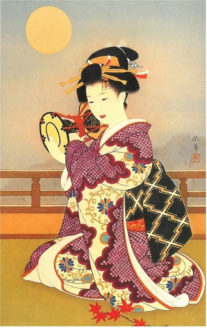 Elegancki japoński karnet premium z piękną, artystyczną ilustracją.Przedstawia portret młodej kobiety (gejszy/maiko) w bogato zdobionym fioletowo-czarnym kimonie z tradycyjnymi wzorami. Kobieta siedzi w eleganckiej pozie, trzymając w dłoniach japoński bębenek (tsuzumi), oddając się grze. Ma klasyczną, wyszukaną fryzurę z ozdobami i koto. Delikatny, subtelny wyraz twarzy oraz skupiona, pełna gracji poza nadają ilustracji wyjątkowego uroku i artystycznego charakteru. Karnet w zestawie z kopertą, bez tekstu w środku.