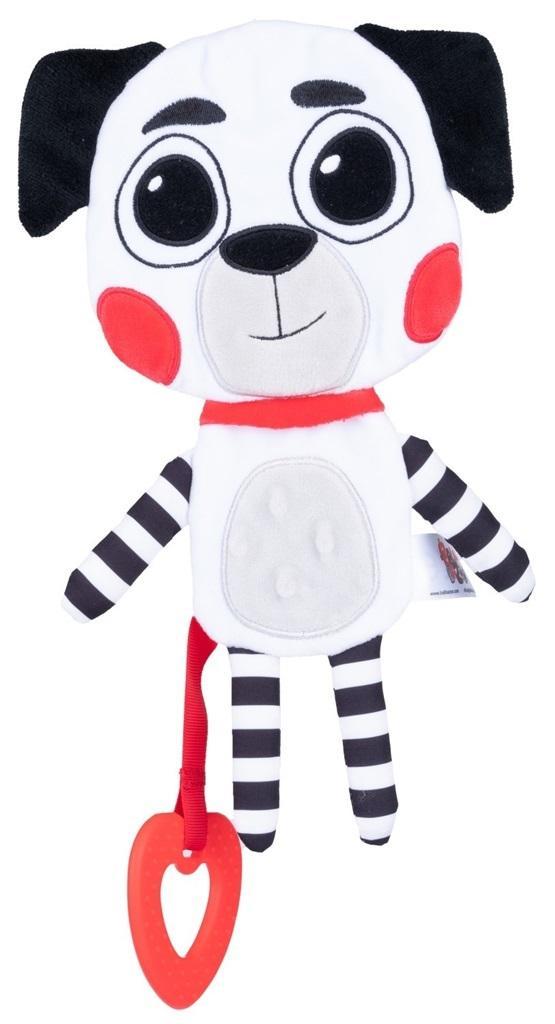 "Milutki psiak stworzony do tulenia. Jego ciałko uroczo szeleści, a zróżnicowane faktury materiałów, z których został wykonany, wspomagają rozwój zdolności poznawczych dziecka. Zabawkę zdobi miękki gryzak z wypustkami, który przyniesie ulgę podczas ząbkowania. Wyraziste, kontrastowe kolory zwierzaka stymulują zmysł wzroku malucha już od pierwszych dni jego życia.
