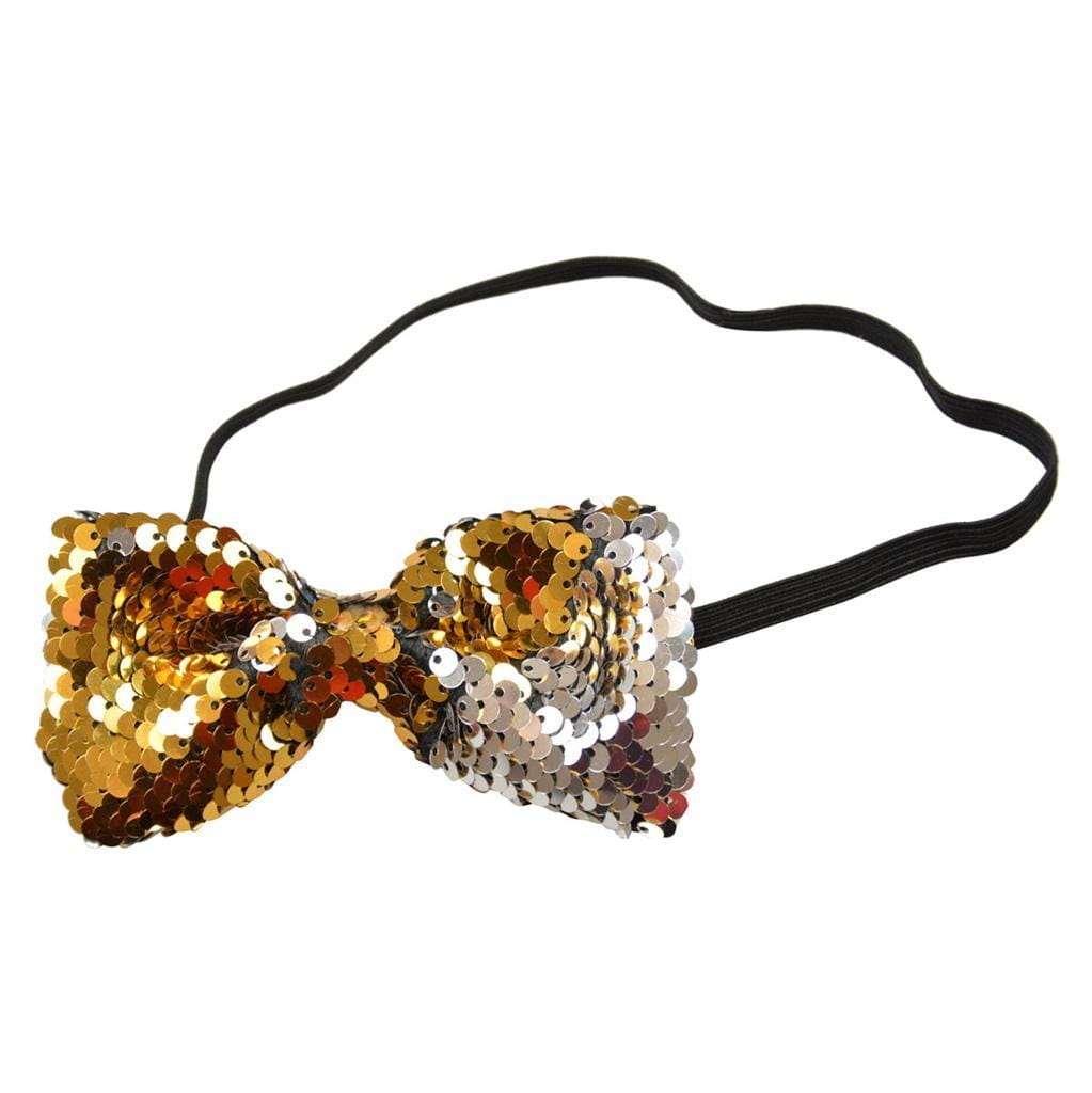 Muszka z cekinami dwustronnymi mocowana na elastycznej gumce. Przełam nudę - zmień kolory. Rozmiar: 11,5 x 6 cm Kolor: złoto-srebrny