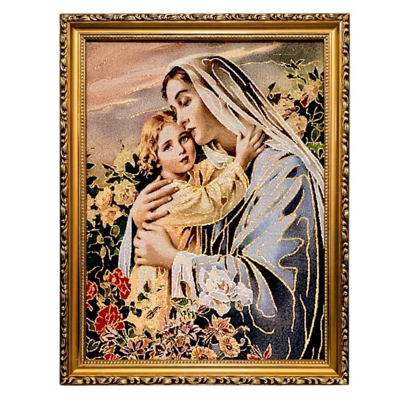 Haftowany Obraz Maryja Tuląca Jezusa w Złotej Ramie - Czułość i Kwiaty (42x32 cm)