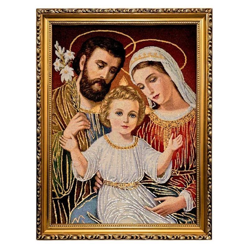 Wykonany z dbałością o detale, oddający miłość i oddanie Świętej Rodziny oraz boskie błogosławieństwo Jezusa. Złote nici dodają obrazowi uroczystego i sakralnego charakteru. Elegancka złota rama podkreśla jego piękno i jest gotowa do zawieszenia. To idealny prezent dla osób ceniących duchowe wartości i poszukujących inspiracji w miłości Boga.