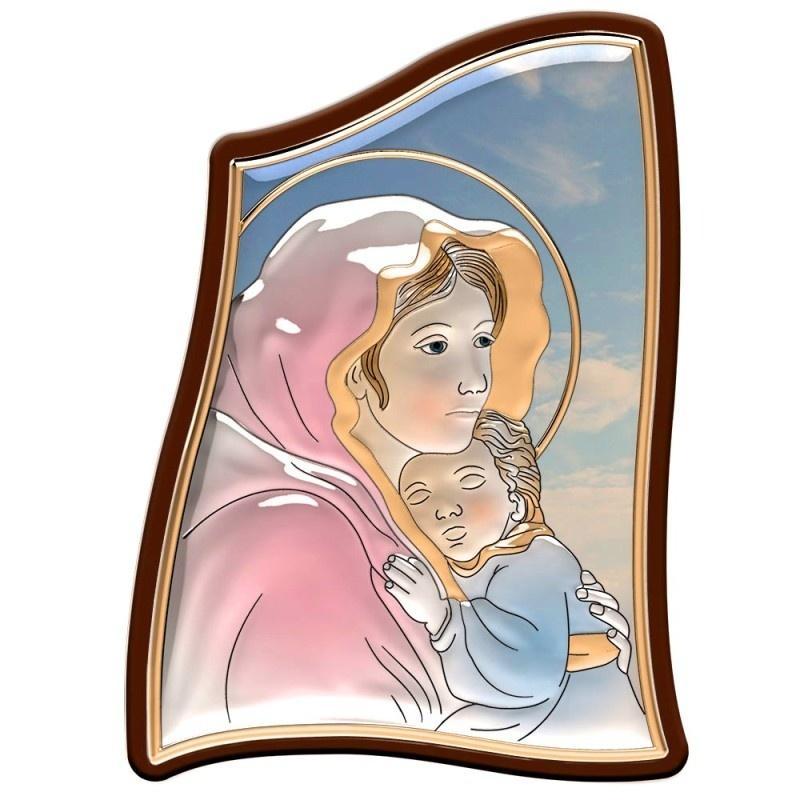 Srebrny Kolorowany Obrazek Matka Boża z Dzieciątkiem na Drewnie - 20x14,5 cm, Z Podstawką.