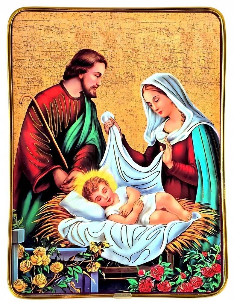 Odkryj piękno i duchową głębię obrazu przedstawiającego Świętą Rodzinę. Mały Jezus, spokojnie śpi, a Maryja okrywa go materiałem. Św. Józef, z troską w oczach, wpatruje się w Maryję i śpiące Dzieciątko. Przed łóżeczkiem Jezusa znajdują się piękne, żółte i czerwone róże, symbolizujące miłość i ofiarę. Całe przedstawienie emanuje ciepłem, spokojem i miłością, ukazując idealny obraz rodzinnej harmonii i nawiązuje do bożonarodzeniowej sceny z żłóbka. Obrazek ma wymiary 15x20 cm i oprawiony jest w złotą, plastikową ramkę. Idealnie nadaje się do postawienia na półce.
