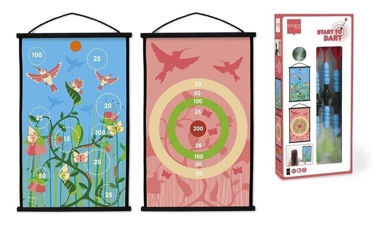 START TO DART _KOLIBRY - dwustronna tarcza z rzutkami z motywem Kolibrów. START TO DART - to bezpieczna zabawa dla młodszych wielbicieli rzutek. Gra polega na jak najbardziej precyzyjnym trafieniu rzutkami w tarczę, gdzie rozmieszczono punkty za każdy oddany rzut. Tarcza jest dwustronna co pozwala na zabawę na dwa różne sposoby. Do tarczy dołączono 6 sztuk bezpiecznych rzutek z gumową przyssawką. Dzięki temu rzutki mają odpowiednie wykończenie bezpieczne dla młodszych dzieci, które rozpoczynają zabawę w popularną grę w dart. Dart to znana i lubiana gra, która rozwija zręczność i koordynację ruchowo-wzrokową u dzieci.