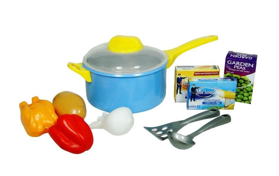 W zestawie znajduje się m. in. garnek, ziemniak, pomidor, kurczak, cebula, ciasteczka i gofry (kartoniki) oraz akcesoria kuchenne. Towar zapakowany jest w siatkę. Zabawka dla dzieci od 3 lat.