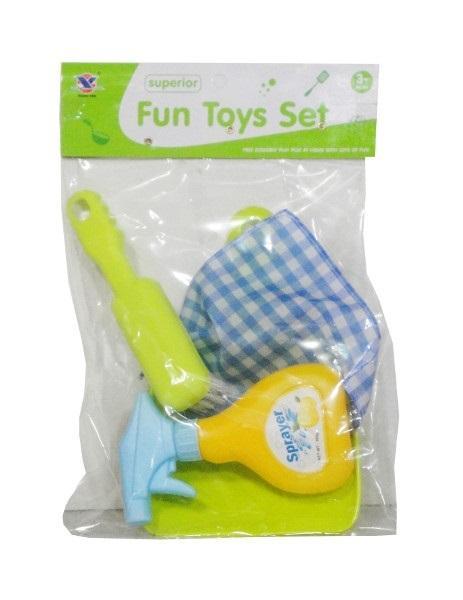 Zestaw do sprzątania zapakowany w przezroczysty worek. W zestawie znajduje się: szufelka, zmiotka, zraszacz oraz szmatka. Zabawka dla dzieci od 3 lat. Podane wymiary są wymiarami produktu w opakowaniu.