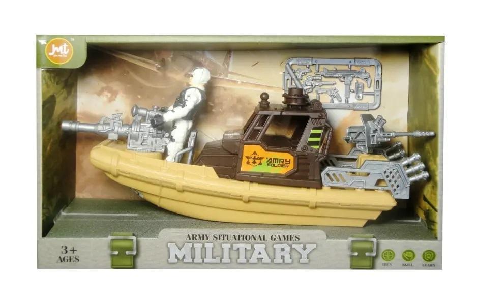 Zestaw wojskowy dla chłopców. W opakowaniu: łódź, figurka żołnierza i zestaw broni dla żołnierza. Armata znajdująca się na łodzi świeci kolorowym światełkiem. Zabawka działa ba naterie typu AG13. Baterie znajdują się w zabawce. Produkt zapakowany w kartonowe opakowanie z okienkiem. Zabawka dla dzieci od 3 lat. Podane wymiary są wymiarami opakowania.